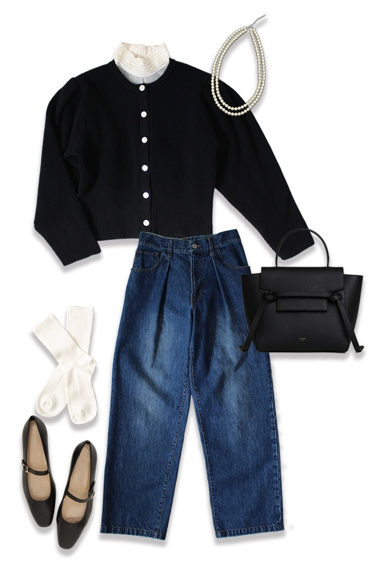 こちらはニットカーデを使ったきれいめカジュアルスタイル